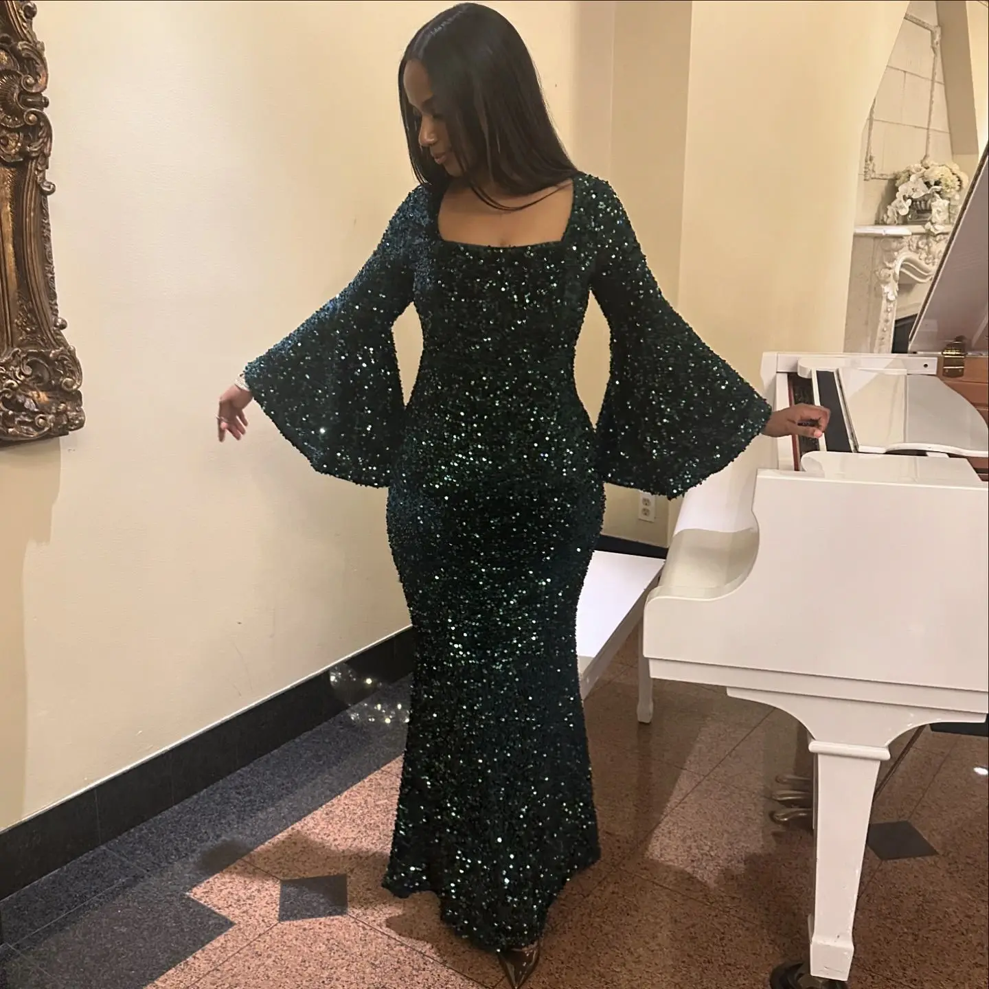 Sequins Square Collar Mermaid Cocktail Dresses Flare Sleeve Zipper Bodycon Sexy Evening Gowns Elegant Special Occasion Dress
